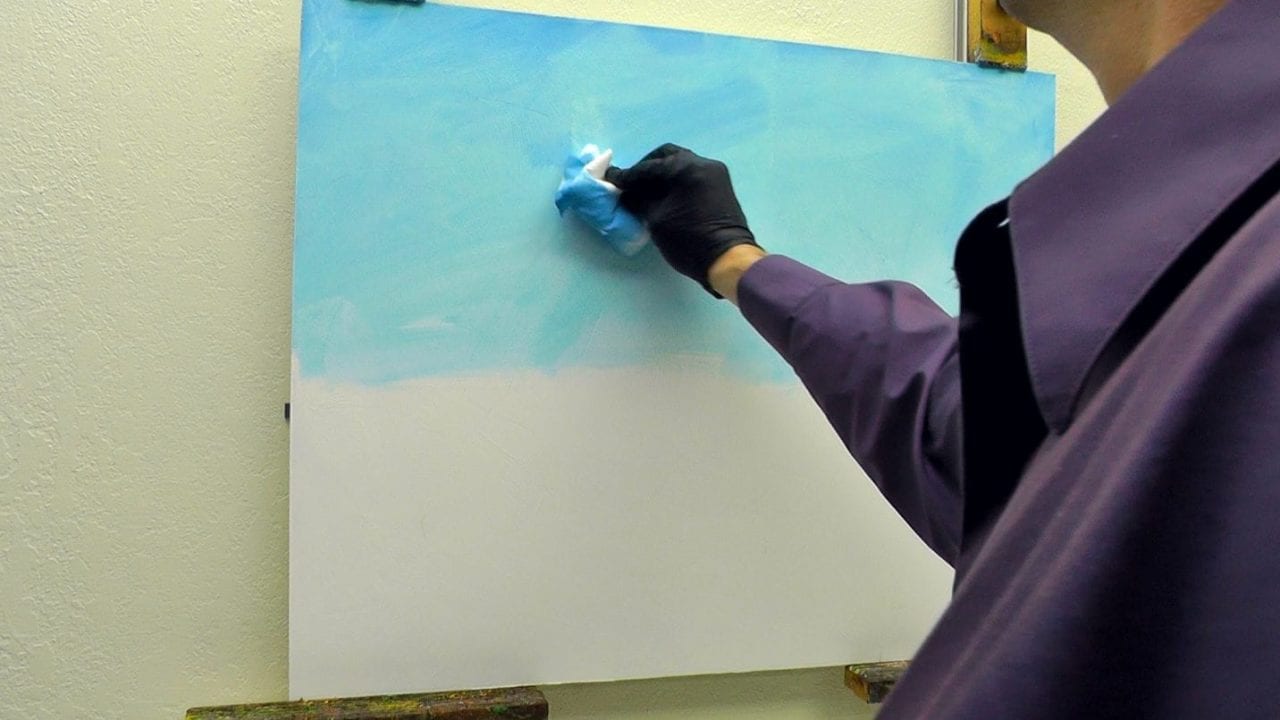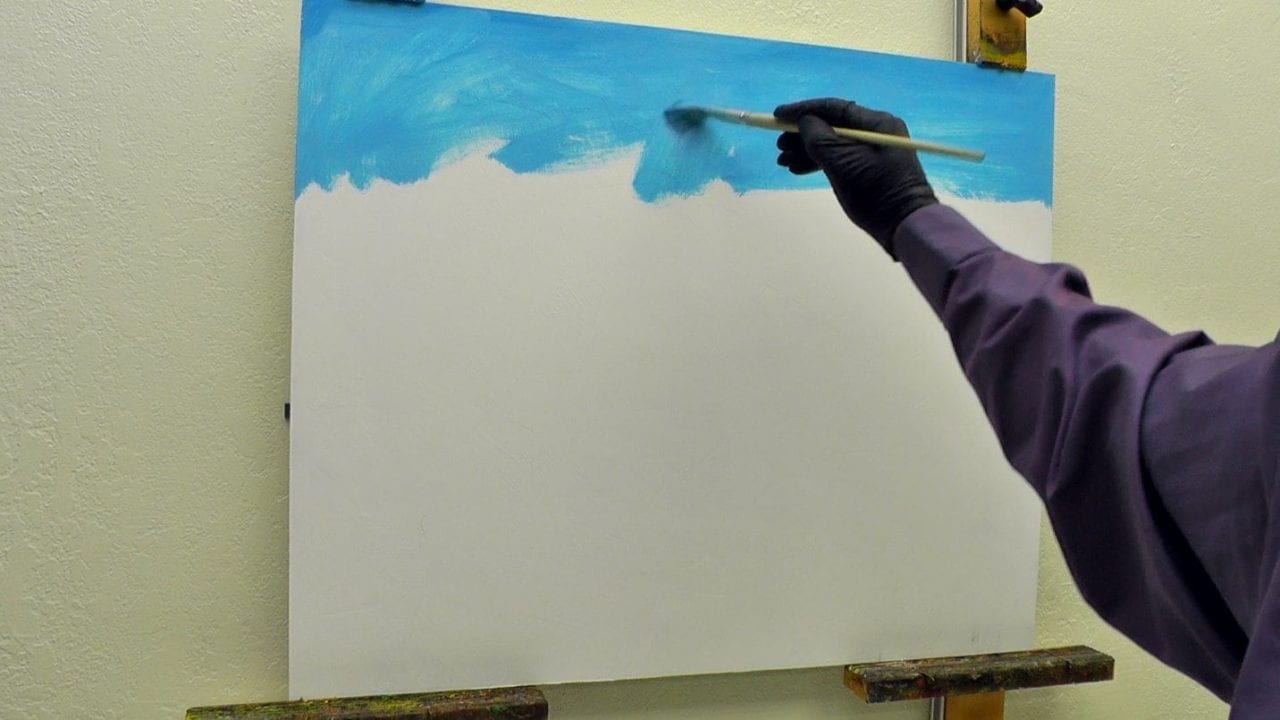 Brushing in a thin layer of Phthalo Blue mixed with white created the sky.