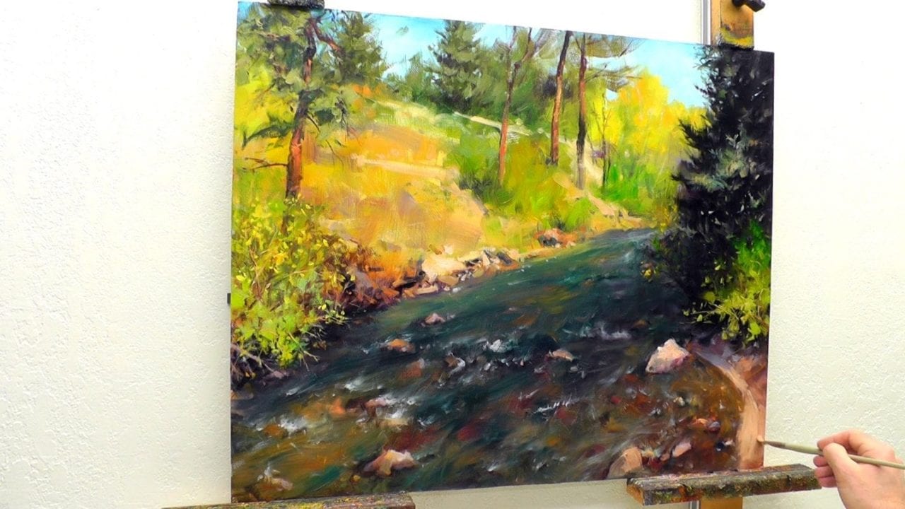 The river paint strokes I applied with a large size 10 or 12 hog bristle brush. With long sweeping strokes I alternated lighter and darker colors to simulate rushing water over a rocky bed.